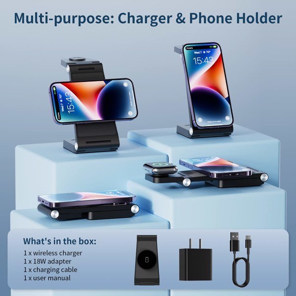3 in 1 Folding Wireless Charger The charging station for multiple devices, support charging iPhone, iwatch, AirPods simultaneously. It is compatible for all iPhone 12-14 series. Compact size, well built, fast charging, space saving, exactly what you need! (NOTE: Please take off your phone case when charging, or use a special magnetic charging mobile phone case.)