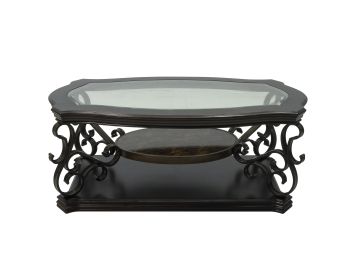 Cocktail Table, Glass table top, MDF W/marble paper middle shelf, powder coat finish metal legs. (52"Lx32"Wx20.3"H)