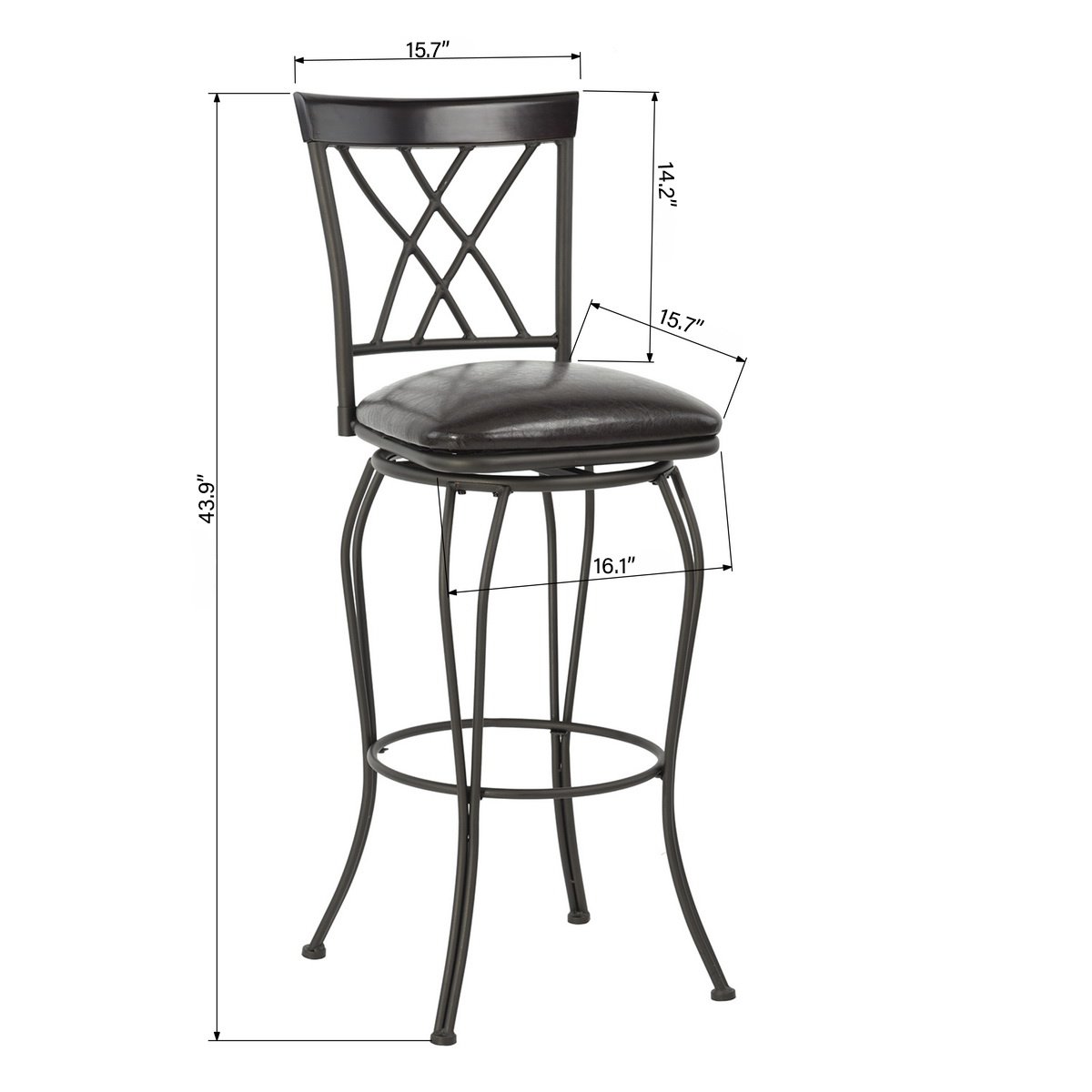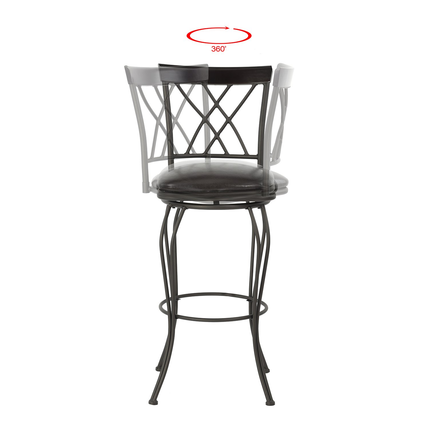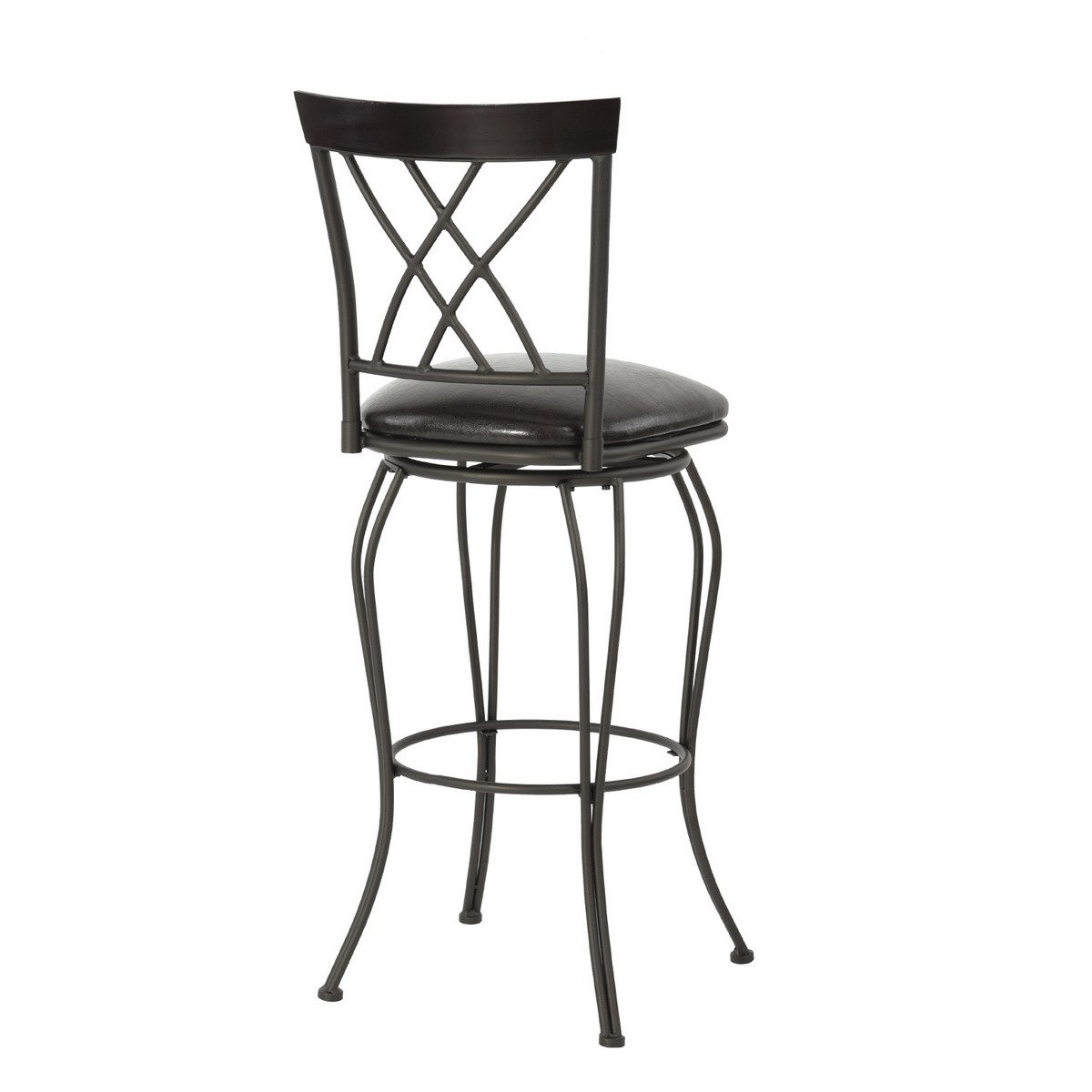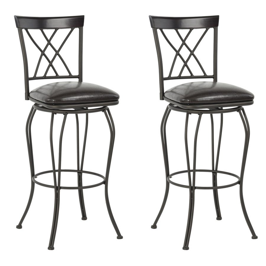 Description:Set Of 2 barstoolWith this set of two stools at your bar or counter you'll always have an inviting perch for a morning coffee, quick lunch, or weekend cocktail. The frames are made from sturdy steel in a warm brown hue, and the curvy legs are bound by rings that double as footrests. Each stool has a full back with double-X detailing and a foam-padded seat that's wrapped in easy care faux leather. Plastic glides on the feet protect your floors from scratches and scuffs. And, we love how these stools swivel a full 360 so you can turn your attention to anything in the room without leaving your seat.Product DetailsSeat MaterialPlywood + Foam + PUFrame MaterialSteelColorBlackAdult Assembly RequiredYesWeight Capacity250 lbSeat Material DetailsFaux LeatherUpholstery Fill MaterialFoam