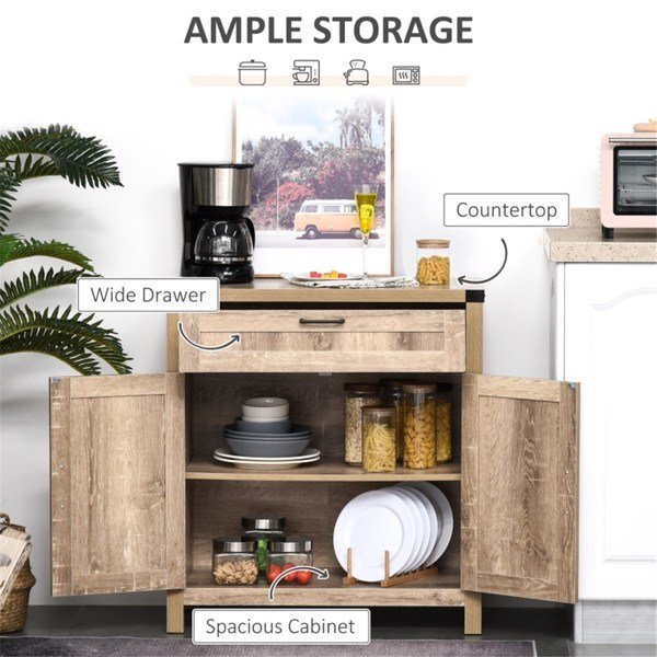 Features:- Industrial design with barn door style door makes your home environment more appealing- Can be placed in your kitchen, dining room, living room, or entryway- Ample storage space with a countertop, a drawer, and a door cabinet- Suitable for the storage of utensils, kitchenware, small electric appliances, bottles, and jars, etc.- Anti-toppling device adds extra stability- Assembly requiredSpecification:- Color: Oak- Material: Particleboard- Overall Dimension: 30" W x 15.25" D x 32.75" H- Drawer Dimension Inside: 24.5" L x 11.25" D x 3.25" H- Cabinet Door: 13.25" L x 11.25" H- Overall Weight Capacity: 65lbs- Drawer & Shelf Weight Capacity: 10lbsPackage Includes:- 1 x Storage Cabinet- 1 x Manual
