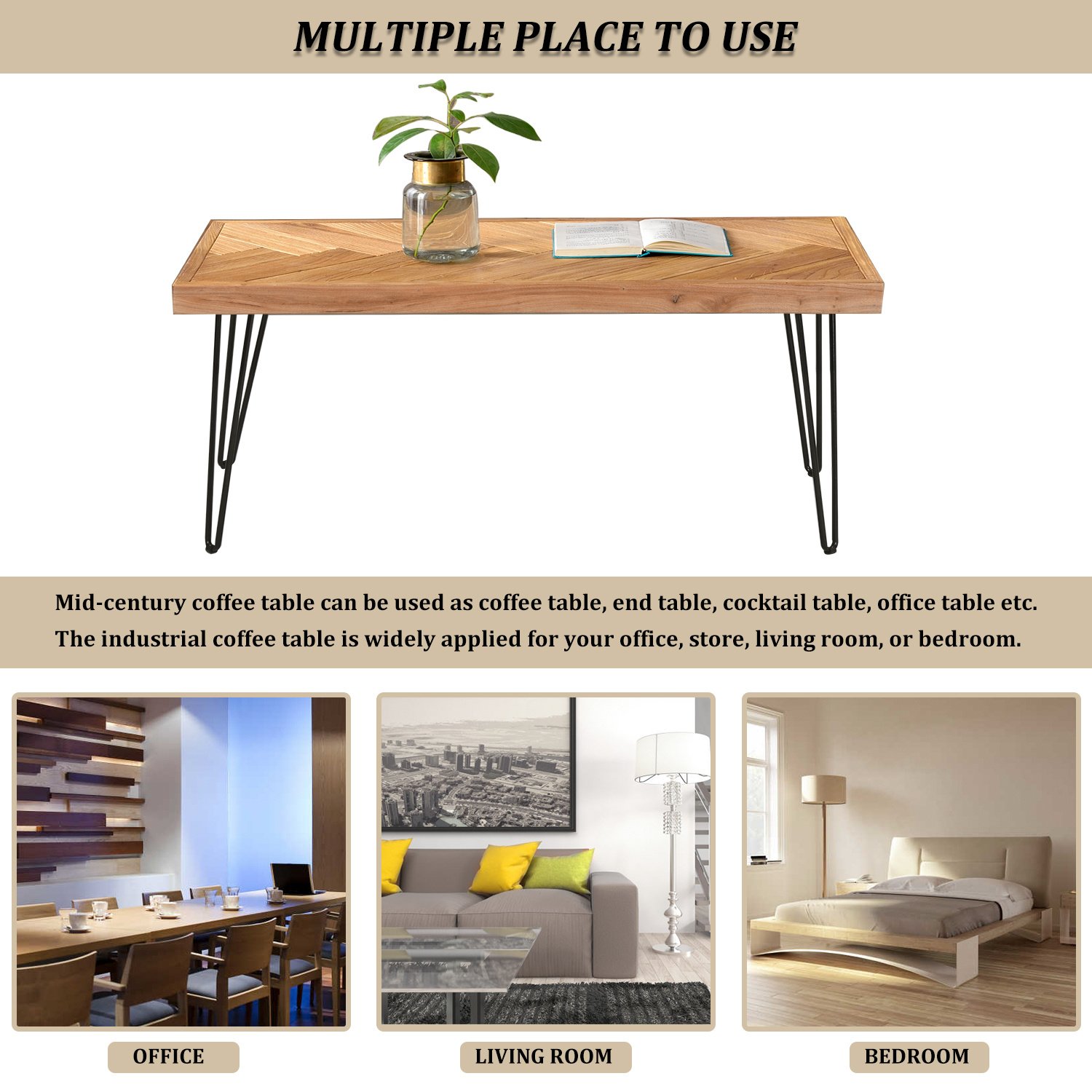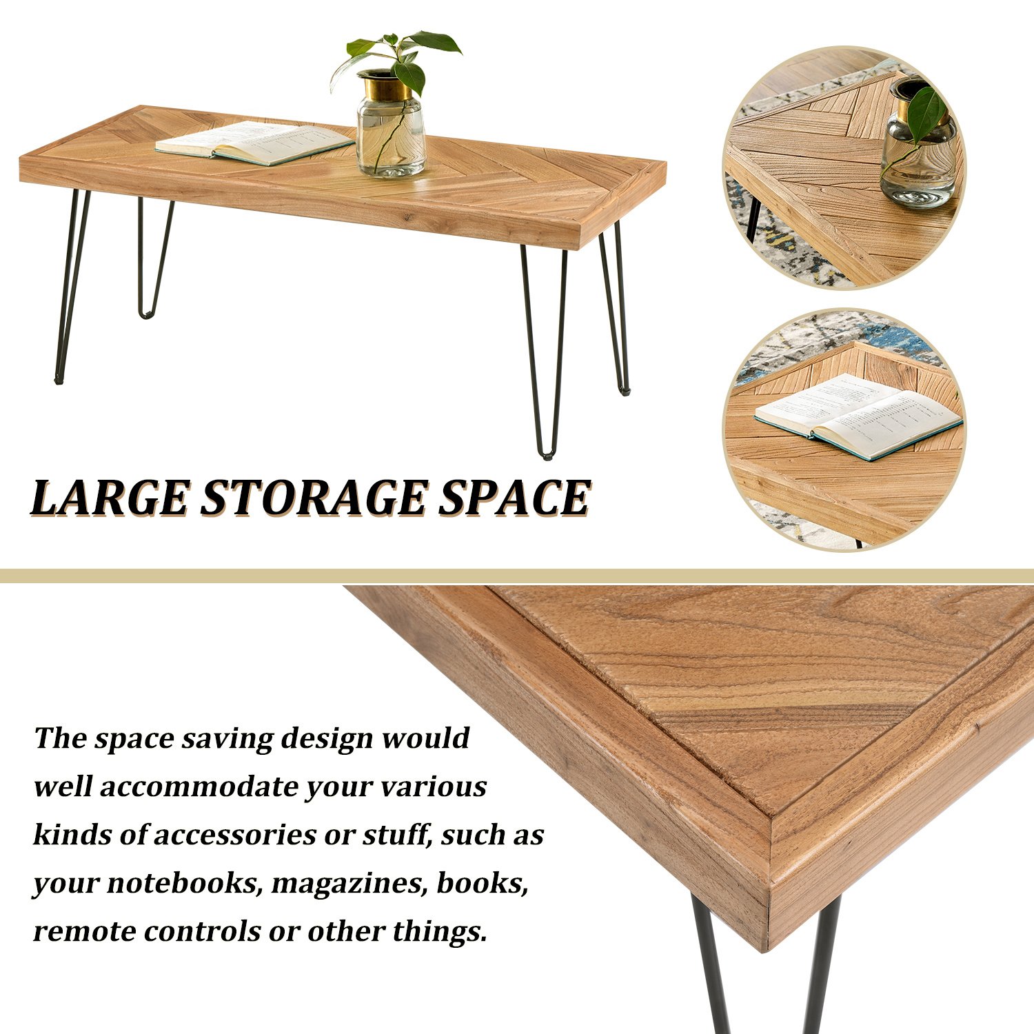Features:1. Sleek and Durable Design--Artfully constructed with modern elegance design, this rectangle coffee table is crafted from high-grade MDF with nature rough wood grain surface of the unique chevron pattern. The Sturdy metal hairpin legs ensure durability and stability. The oak sofa table is strong enough to load up to 66 lbs.2. LARGE STORAGE SPACE-- The space saving design would well accommodate your various kinds of accessories or stuff, such as your notebooks, magazines, books, remote controls or other things.3. MULTIPLE PLACE TO USE- mid-century coffee table can be used as coffee table, end table, cocktail table, office table etc. The industrial coffee table is widely applied for your office, store, living room, or bedroom.4. EASY SELF-ASSEMBLY--The wooden coffee table can be easily assembled with included hardware and tools5. DIMENSIONS--This small coffee table measures 43.3"x19.68"x 17.7"(Lx Wx H). The occasional table height is perfect to pull closer to the couch for snacks, coffee or tea