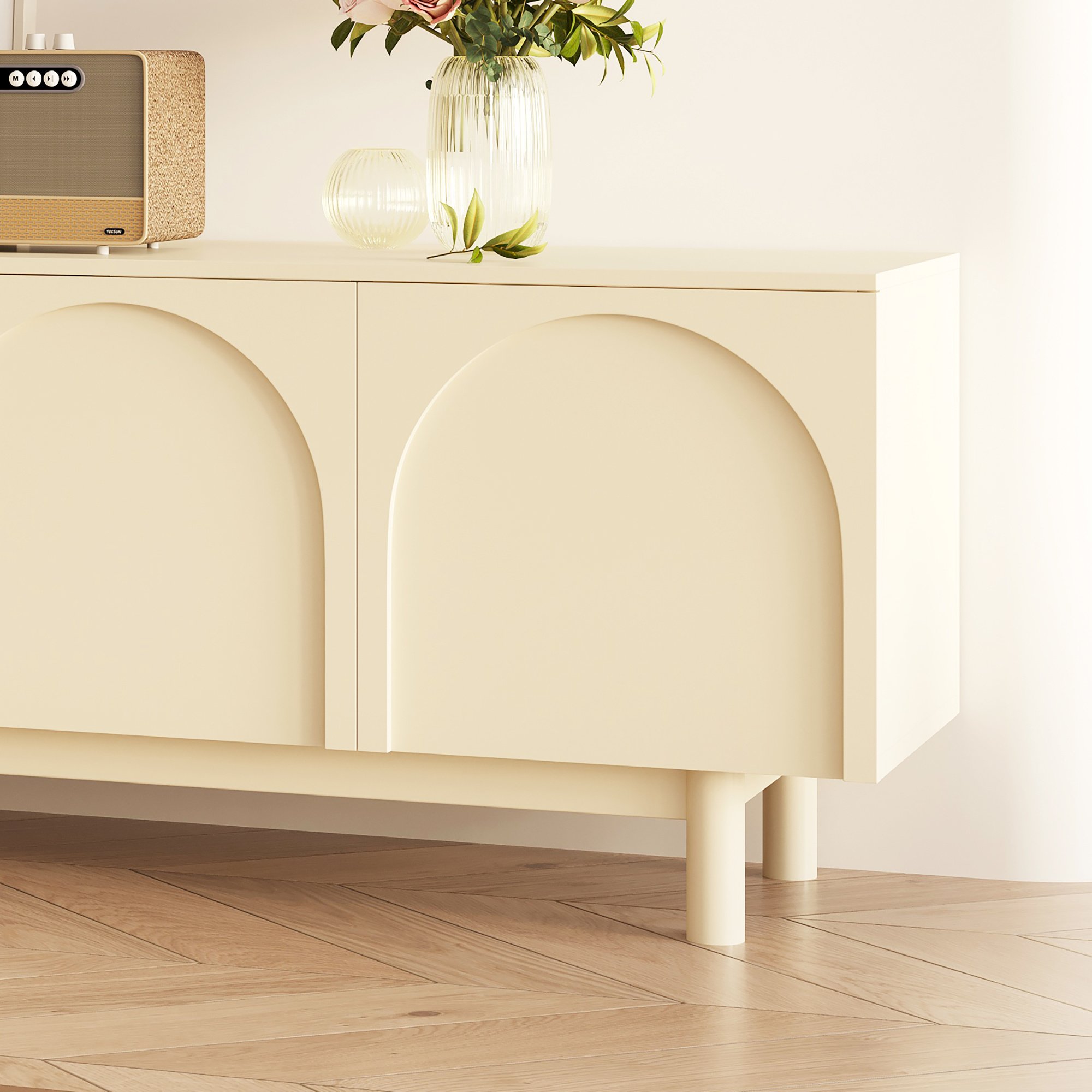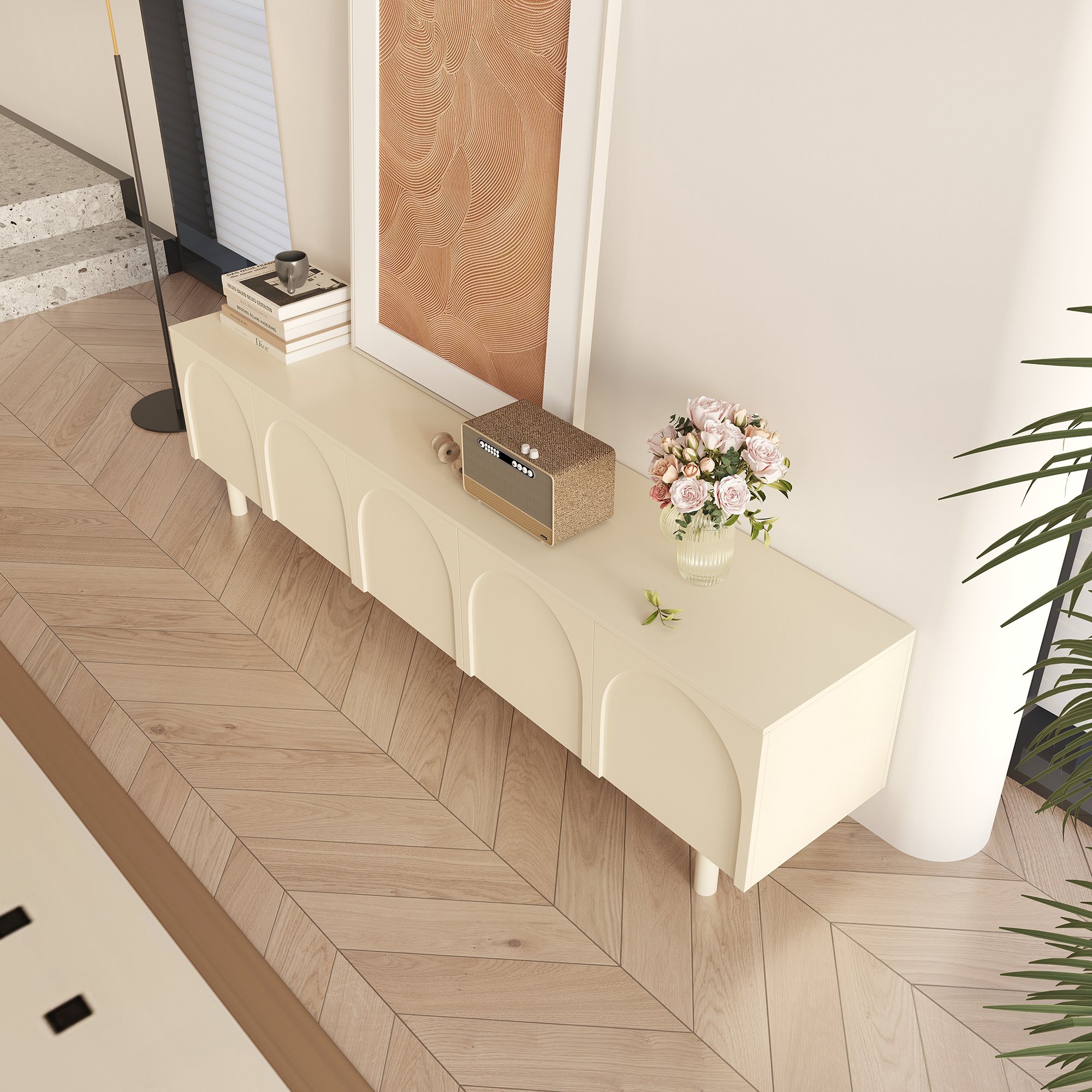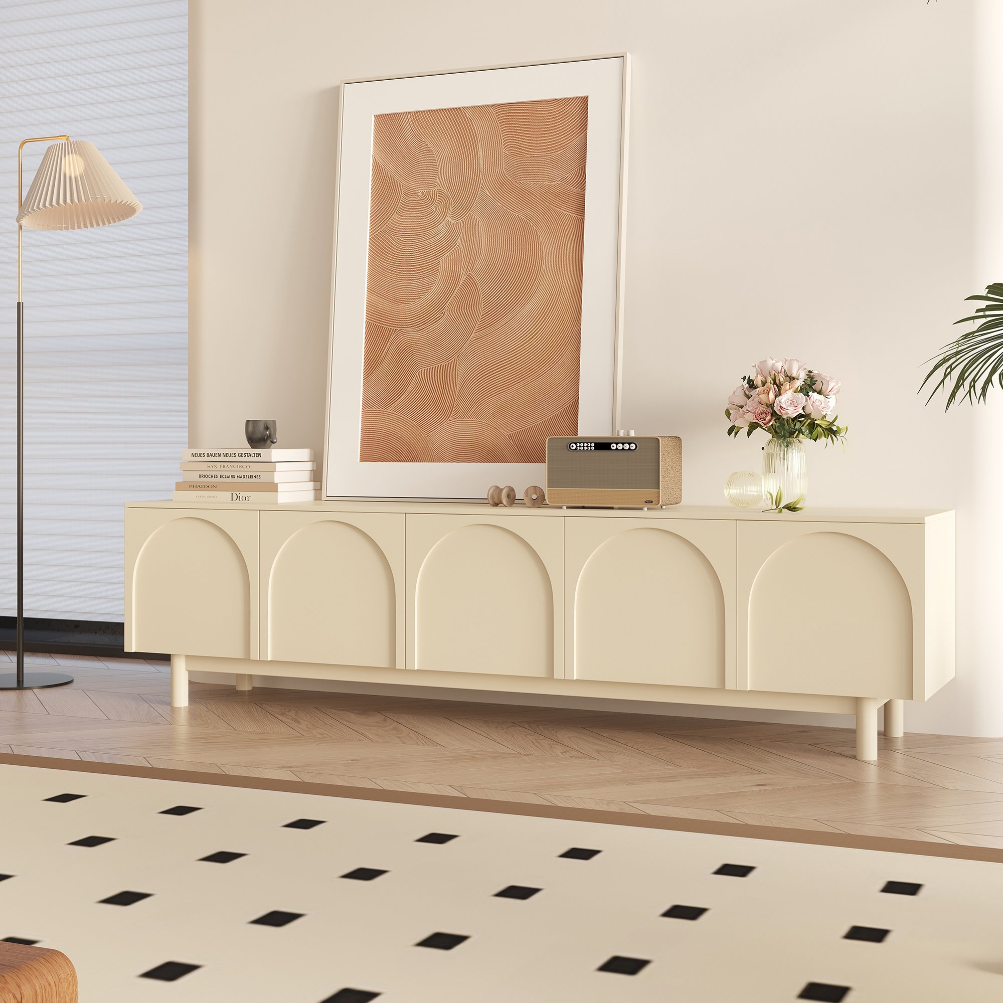 French cream white TV cabinet. Serenity and elegance, show the quality of life. Special arch design. The door panel is derived from the arch shape of Roman architecture, which adds a retro charm. Solid wood legs provide stable load-bearing support, which is convenient for the cleaning robot to clean the bottom of the cabinet. This stand has plenty of storage space: It features 2 cabinets and 6 compartments for displaying books, and accent pieces. The surface easily accommodates a TV screen up to 78".