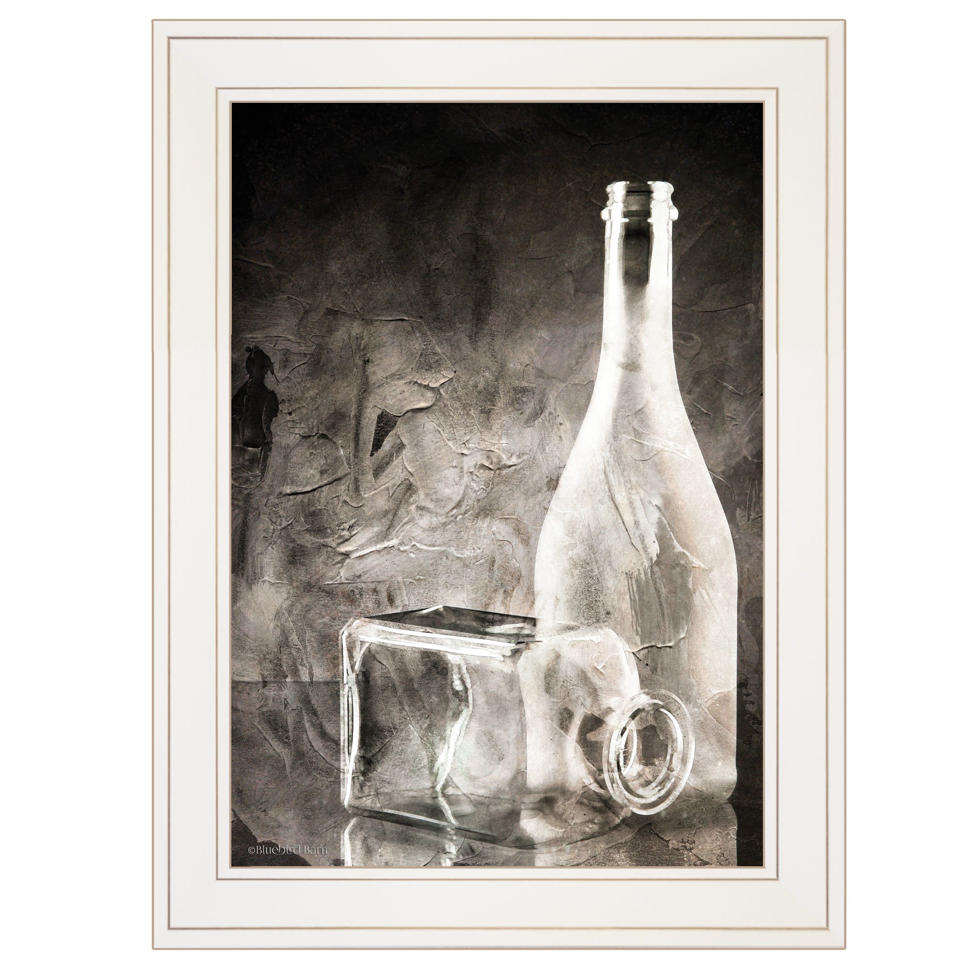 Blue180-226G "Moody Gray Glassware" Still Life by Bluebird Barn. This decorative white framed print (15x19) of 2 bootles of gray glassware. The translucient appearance of the background and bottles makes you stop and think. This framed art is totally American made. The surface of the art is coated with a fade resistant texture which gives it a canvas-like appearance. No glass is necessary. Arrives ready to hang.To view a 2-piece vignette, including this print, please search: V593-226G•Print has fade resistant surface texture, no glass is necessary•Woman Owned Busines (WBE)•Arrives ready to hang, no additional hardware needed on item•individually hand crafted by skilled American workers•frame mitered with precision equipment•Framed art with no glass for safety around children