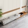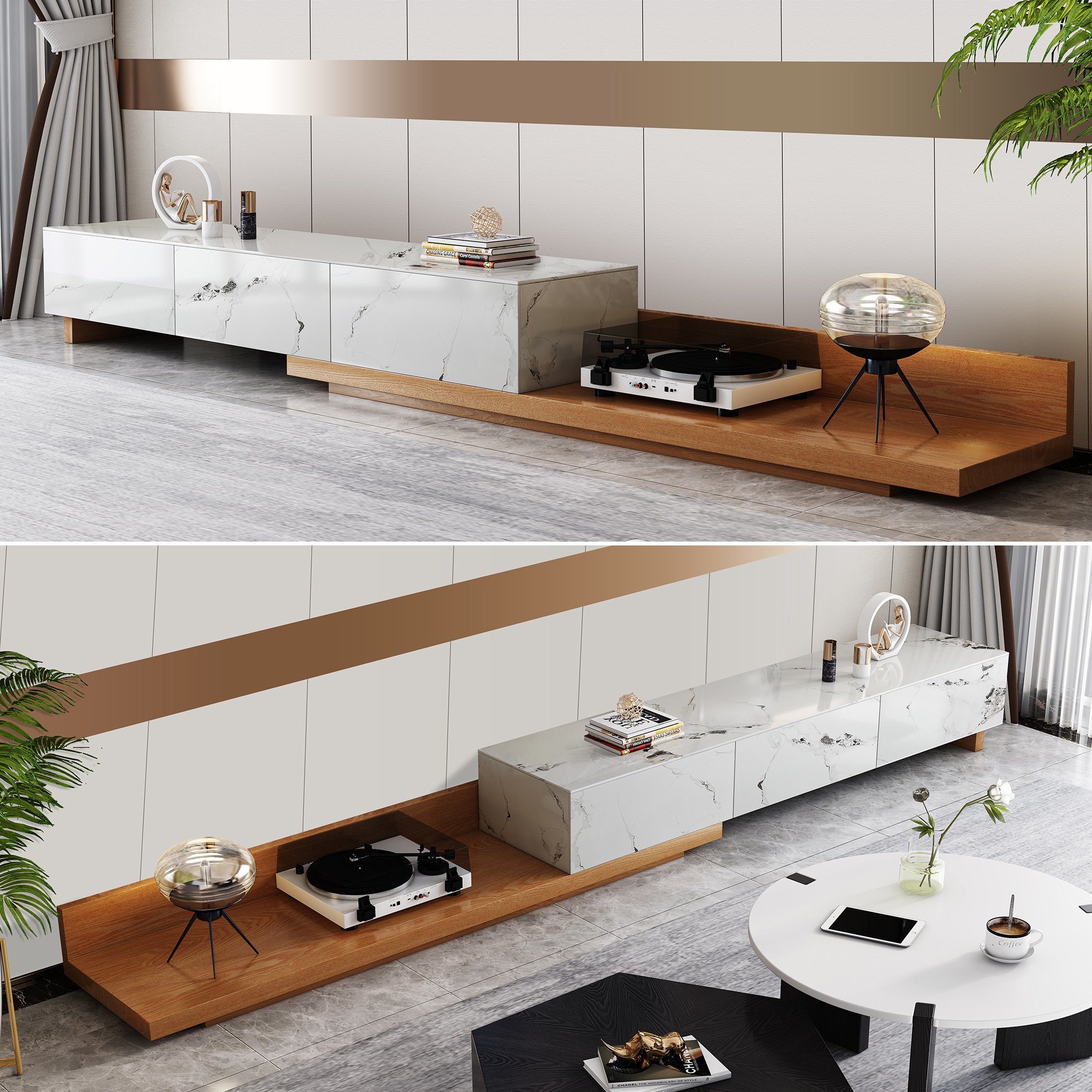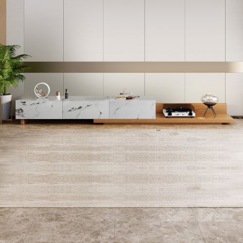 Italian style minimalist faux marble TV stand, with a minimalist look and clean lines, this TV stand comes with two separate projects, consisting of a multi-layer solid wood cabinet with a fully veneered sintered top and a retractable wood shelf. In addition, the natural wood grain of the retractable wood shelf adds a rustic look to this modern industrial booth and complements the luxurious, lightweight décor.